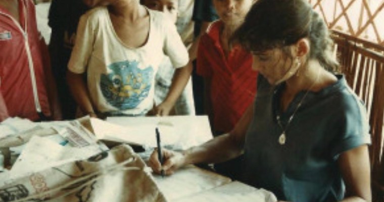 À la fin de mon contrat, le Père Pierre Ceyrac, que j’avais rencontré douze ans plus tôt en Inde, me proposait d’enseigner le dessin aux enfants dans son équipe enseignante de l’ONG Thaï COERR (Catholic Office for Emergency Releaf and Refugees). En vérité, je n’étais pas très chaude. Les dessins des enfants n’étaient alors pour moi que de malhabiles pattes de mouches sans intérêt. Par la suite, ce sont eux qui m’ont convaincue de l’intérêt de la démarche, en me montrant qu’ils étaient capables de parvenir à une authentique expression artistique. Sans le savoir, j’ouvrais là une longue période de ma vie qui m’emporterait jusqu’au Cambodge, avec un projet de reconstruction et de développement.