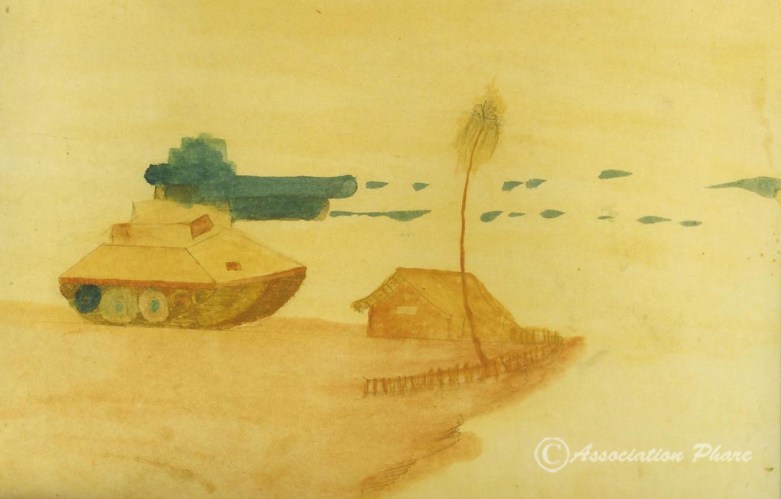Avec mon système de portes ouvertes, j’étais sans cesse confrontée à des vagues de nouveaux arrivants. La période probatoire (qui pouvait durer un mois ou plus) consistait à les laisser s’essayer tout seul devant la feuille blanche. Je ne leur donnais aucune consigne, aucun sujet, aucun avis technique, seulement le matériel de base : à eux de se débrouiller ! S’ils restaient, c’est que l’épreuve avait été passée avec succès. A partir de là, je commençais à leur enseigner les lois de la perspective et je posais les cadres du cours. Les jeunes Khmers possèdent, en général, un sens inné de la couleur et de la composition. Mais, pour qu’ils ne tombent pas dans la fatale répétition de la même image, il fallait les astreindre à l’étude théorique de la perspective et à son application pratique à travers l’observation de paysages, rues, bâtiments…